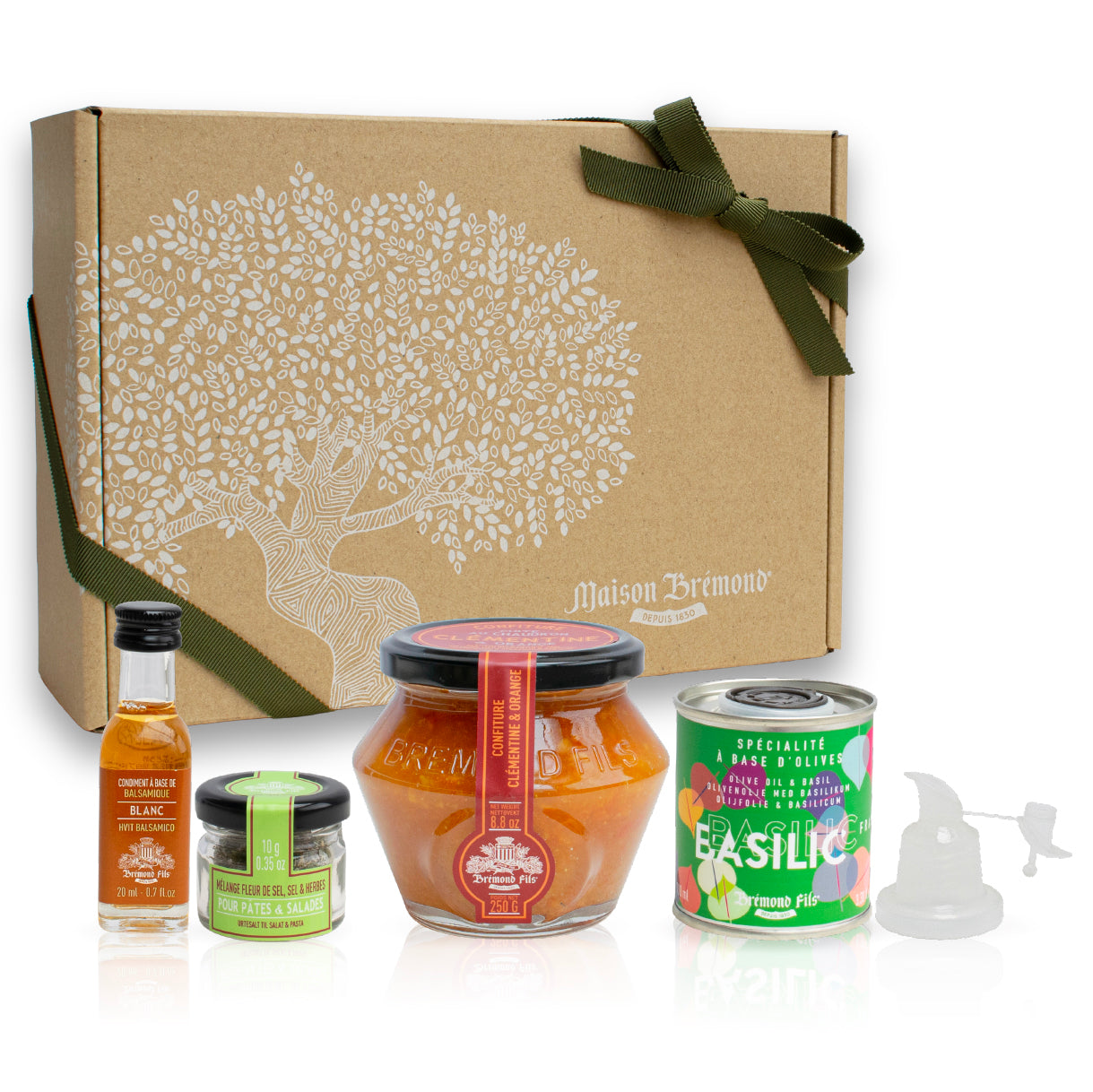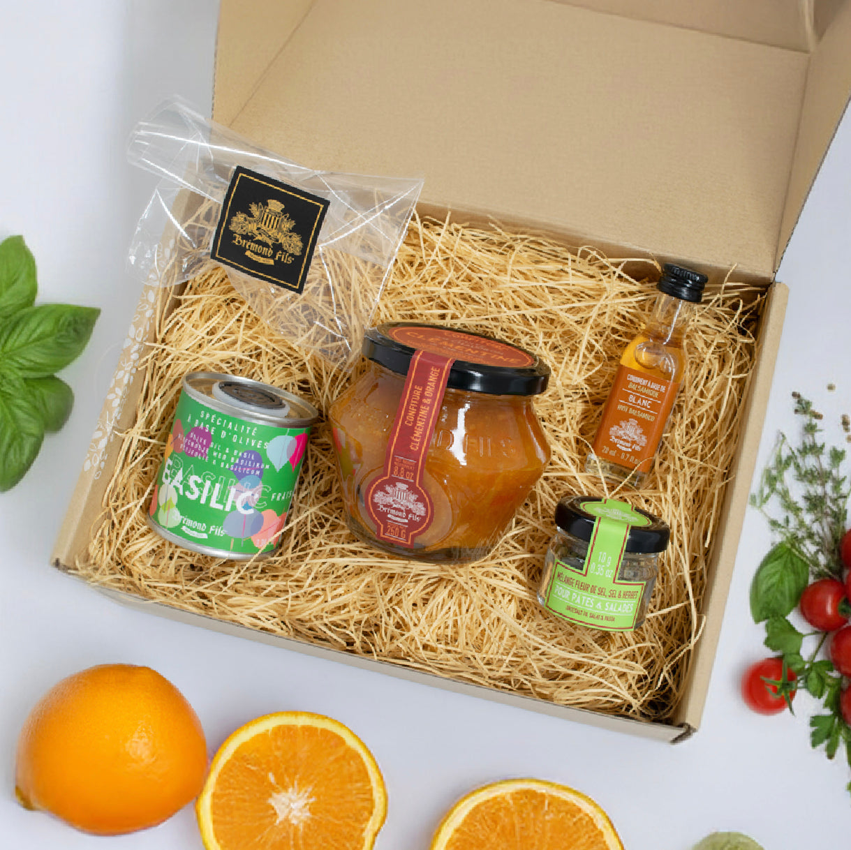 バジルオイルとカマルグソルト、ビネガーにコンフィチュールを合わせた朝食向けセット。パンやサラダ、スープ、ヨーグルトまで、いつもの朝ごはんが簡単にランクアップします。